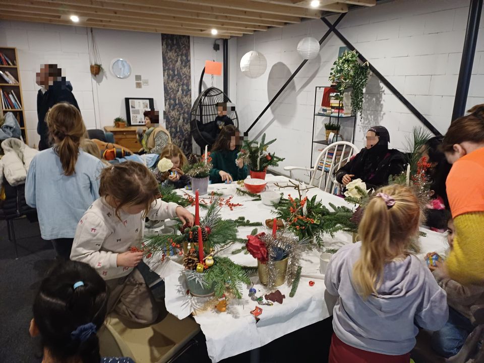 Tijdens de kerstbijeenkomst op 13 december genoten bezoekers van eten, warme chocolademelk en creatieve activiteiten. Met groene takken, versiering en een kaars maakten deelnemers hun eigen kerststukje, dat zij mee naar huis konden nemen voor op tafel of in de vensterbank. Zowel kinderen als ouderen deden enthousiast mee, wat zorgde voor een warme en levendige sfeer.