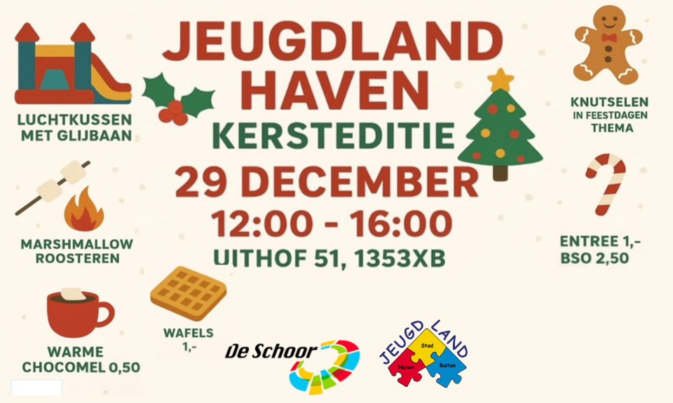 Ook dit jaar organiseert Jeugdland Haven een spetterend feest in de kerstvakantie. Het hele gezin is welkom om mee te genieten van een middag vol spel en creativiteit. Kinderen betalen slechts €1 entree en kunnen daarna gratis deelnemen aan alle activiteiten.