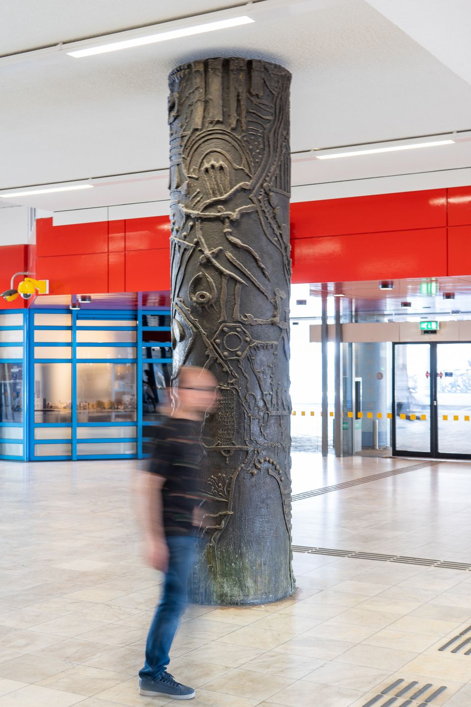De klassiek aandoende zuil met een reliëf van ornamenten vormt een groot contrast met de moderne stationshal. De zuil heeft dezelfde maatvoering als de kolommen in de hal. De kunstenaar van dit kunstwerk is Peer Veneman