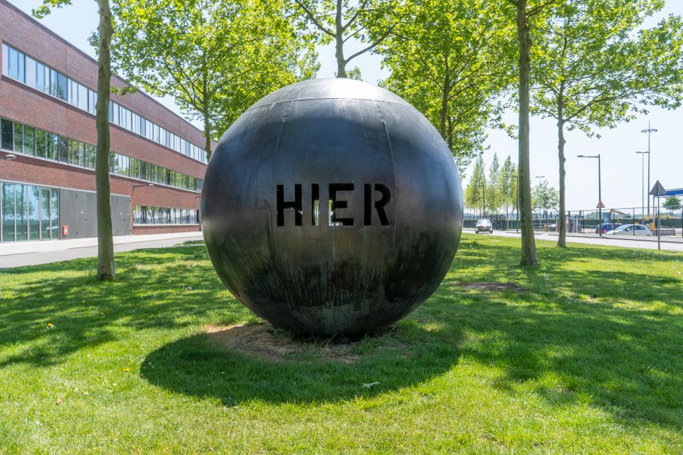 De enorme koperen bol met schreefloze hoofdletters H I E R dwars door uitgespaard kan om zijn as draaien, geef hem maar een een draai!