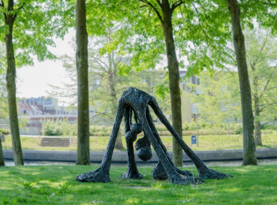 Het beeld werd in opdracht van Rijkswaterstaat gerealiseerd als onderdeel van een kunstproject om het jonge stadscentrum karakter te geven. De vijfbenige, bronzen figuur met bolvormige elementen lijkt stevig verankerd in de aarde. In de grillige vormen herken je zowel menselijke als dierlijke trekken. De schuine plaatsing verwijst naar het oorspronkelijke talud aan de Delfzijlsingel, waar het werk in 1993 werd onthuld.