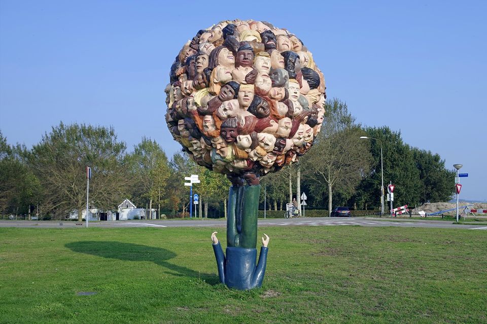 Een figuur staat op zijn kop in het gras. Op zijn voeten rust een grote bal die is gemaakt van heel veel hoofden. Het is een wereldbol die door de voeten van de omgekeerde figuur draaiend wordt gehouden. Aanleiding van het beeld was het afscheid van Jan de
