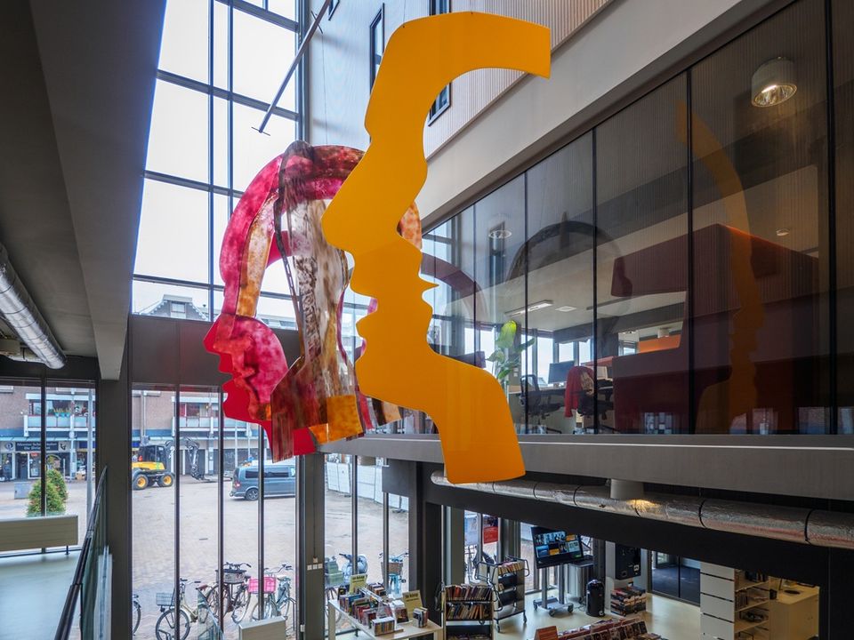 De mobiel bestaat uit vier gezichten, waarvan twee hoofden in elkaar vervlochten en twee gezichten met een contour van een man en een vrouw, samen een eenheid. Theater is kleur. Het kunstwerk hing oorspronkelijk boven de trap die naar de theaterzaal leidde.