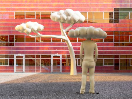 Het kunstwerk bestaat uit twee sculpturen, een reusachtige boom met twee wolkachtige kruinen die...